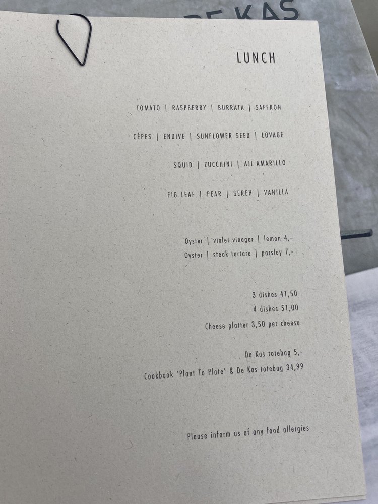 De Kas, a unique farm-to-table dining experience located in a greenhouse in Amsterdam, offers a fixed 5-course menu showcasing fresh, locally grown vegetables and herbs. The ambiance is stunning, with a beautiful setting and attentive service. Customers rave about the exquisite dishes, such as steak tartare oysters, pork belly with celery root and truffle, and mackerel. The restaurant caters to vegetarians, vegans, and those seeking a plant-based fine dining experience. Reservations are highly recommended due to the popularity of the establishment, and the pricing is reasonable for a Michelin-starred restaurant. Overall, De Kas stands out for its fresh, flavorful dishes, unique setting, and top-notch service, making it a must-visit for anyone looking for a memorable dining experience in Amsterdam.